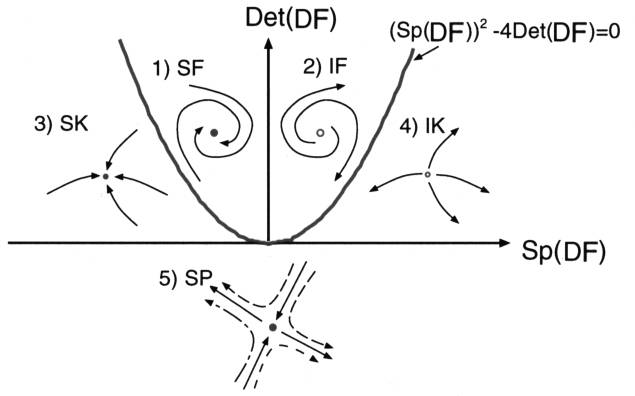 genaue Klassifizierung der Fixpunkte erfolgt nach (siehe Graphik): 1. stabiler Fokus (SF):